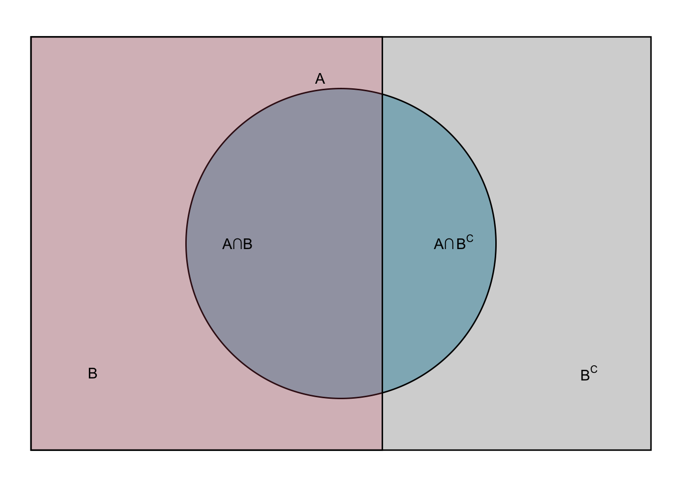 \[\begin{equation} \mathbb{P}(A) = \mathbb{P}(A \cap B) + \mathbb{P}(A \cap B^c) \tag{5.1} \end{equation}\]