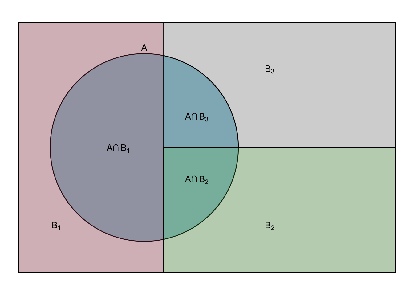 Definicja na początek: Rozbiciem przestrzeni zdarzeń \(\Omega\) będziemy nazywali zestaw wzajemnie rozłącznych (\(B_i \cap B_j = \emptyset\)) zdarzeń \(B_1\), \(B_2\),..., \(B_k\), których suma stanowi całą przestrzeń (\(\Omega = B_1 \cup B_2 \cup ... \cup B_k\)).