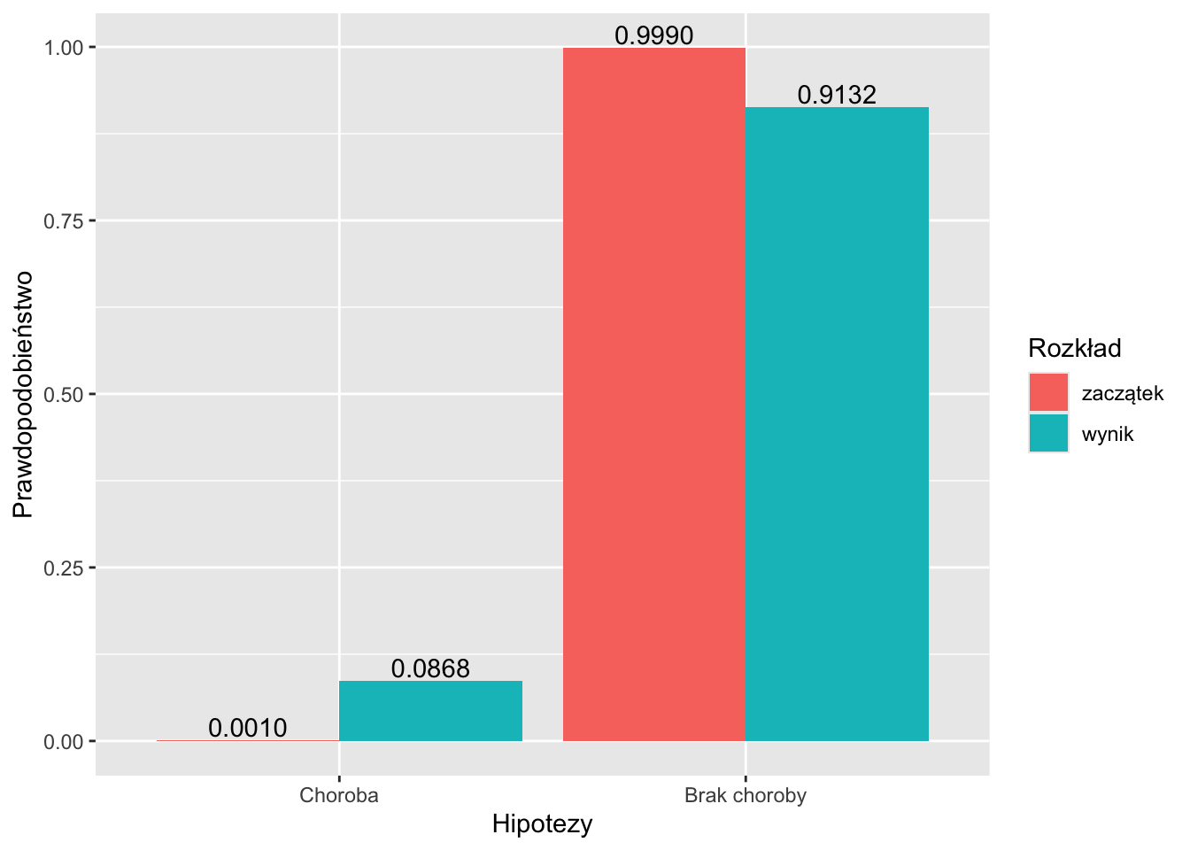Mamy dwie hipotezy (rozbicie dwuczłonowe): \(H\) – wylosowana osoba jest chora i \(H^C\) – wylosowana osoba nie jest chora. Prawdopodobieństwa zaczątkowe to \(\mathbb{P}(H) = 0{,}001\) i \(\mathbb{P}(H^C) = 0{,}999\). Nasze dane \(D\) to pozytywny test. Zdarzalności, czyli prawdopodobieństwa otrzymania pozytywnego testu w sytuacji prawdziwości hipotez \(H\) i \(H^C\), wynoszą odpowiednio \(\mathbb{P}(D|H)=0{,}95\) i \(\mathbb{P}(D|H^C) = 0{,}01\). Poszukujemy prawdopodobieństwa, że osoba jest chora, gdy znamy już dane (pozytywny wynik testu): \(\mathbb{P}(H|D)\).