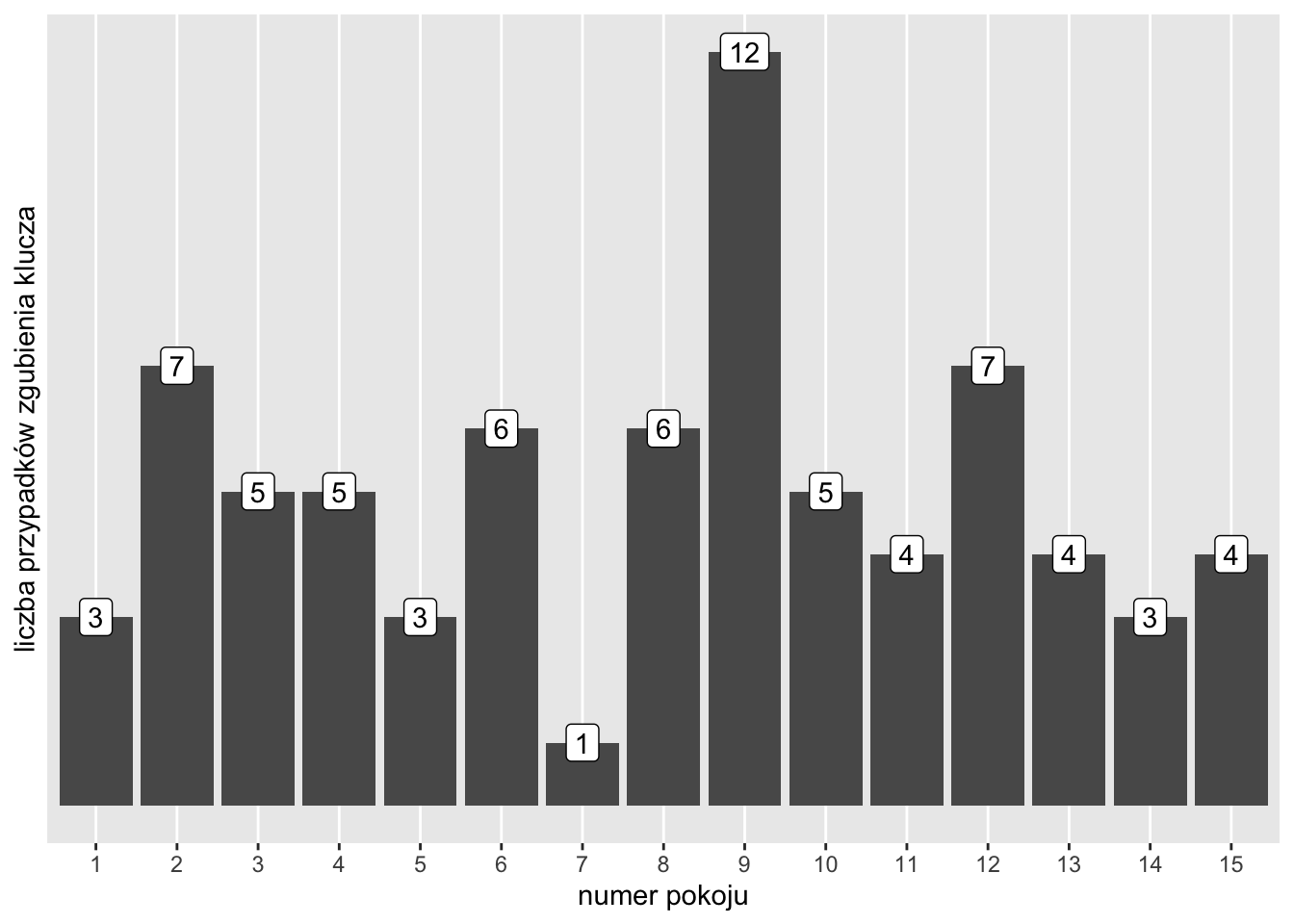 Zadanie 15.5 W opowiadaniu „Dziewięć” (stanowiącym fragment powieści „Bieguni”) Olga Tokarczuk opisuje hotel, w którym częściej niż inne klucze gubił się klucz numer dziewięć. Załóżmy, że uzyskaliśmy dane z tego hotelu, jest w nim 15 pokoi, liczba przypadków zgubienia klucza od czasu założenia hotelu wynosi 75, a w podziale na poszczególne pokoje wygląda tak, jak na poniższym wykresie.